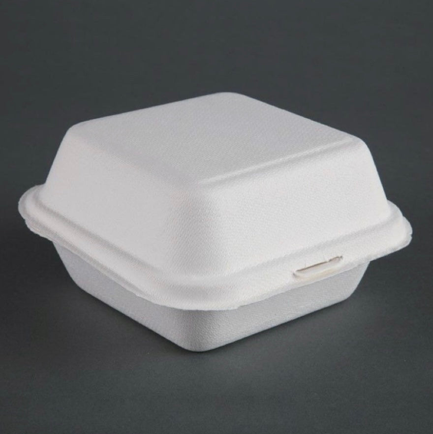 Boite burger en cellulose (pulpe de canne à sucre) de dimension L 150 x l 150 x H 80 mm et de contenance 500 ml.